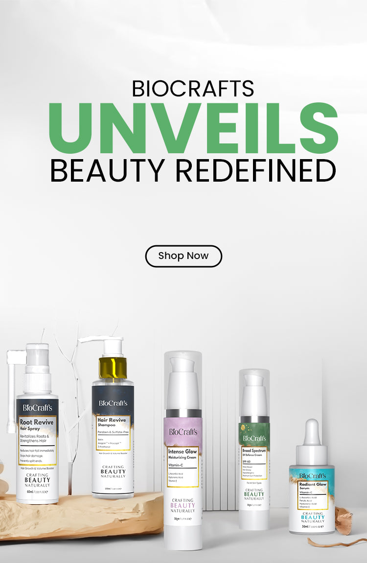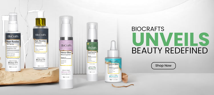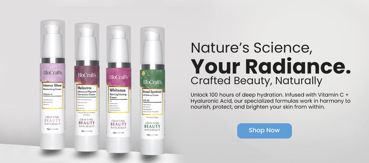 BioCraft is a premium skincare and haircare brand offering scientifically formulated products including face serums, skin lightening creams, moisturizing creams, sunscreens, and hair care solutions like shampoos and sprays.